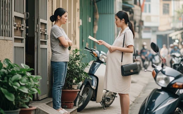Bỗng ngoài cổng vang lên tiếng la oang oang: “Mở cửa ra! Hôm nay tôi đến để nói chuyện phải quấy!”. Lan chưa kịp hiểu gì thì cánh cổng bật mở, một người phụ nữ bụng bầu lùm lùm, ăn mặc lòe loẹt, đeo vàng khắp tay, tay kia chống nạnh hùng hổ bước vào.