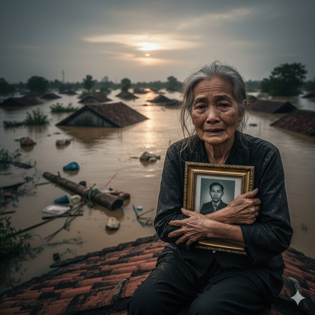 Anh Hai và các em nghe mà chết lặng. “Thứ quan trọng là gì, mẹ?” anh Tư hỏi. Bà Tám lắc đầu: “Tui không mở ra, vì ông dặn chỉ được mở khi ông Sáu trở về.” Nhưng bà chưa dứt lời, một tiếng nổ lớn vang lên. Một cây cột nhà gãy, nước lũ tràn vào mạnh hơn. Anh Ba hét lên: “Mẹ, không kịp nữa! Đưa khung ảnh đây, tụi con cứu mẹ trước!” Bà Tám ôm chặt khung ảnh, nước mắt chảy dài: “Không, tui không bỏ ông!”