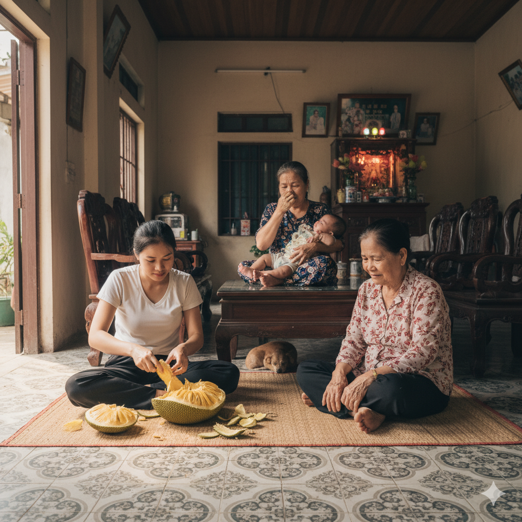 Tôi nghẹn họng. Cả nhà im bặt. Tôi cố cười cho qua, nhưng trong lòng tủi vô cùng. Quả mít mẹ tôi gửi là loại mít mật nổi tiếng, bà hái từ cây mít trồng từ ngày tôi đi lấy chồng, gọi là “mít của con gái”. Vậy mà vừa mở ra đã bị chê bai thậm tệ.
