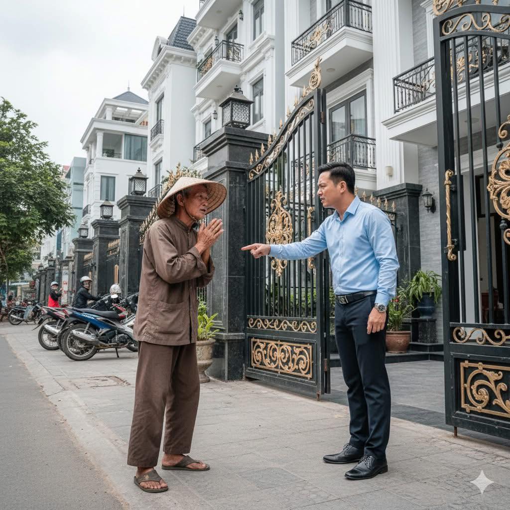 Đôi mắt ông trũng xuống, nhưng ông không giận. Ông chỉ gật đầu, đứng dậy lặng lẽ như một người ăn xin bị từ chối. Nhưng khi ông vừa đứng dậy, tôi kéo tay ông lại rồi quỳ xuống: