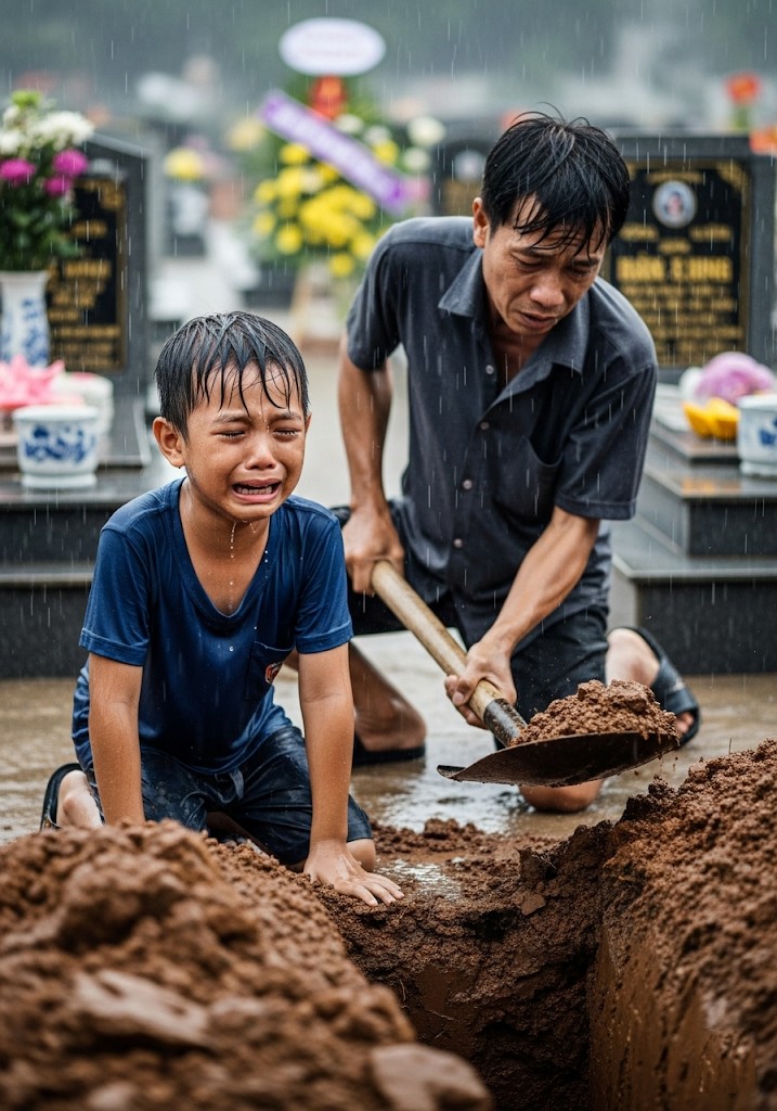 Ông Thái bỏ ngoài tai tất cả. Ông chỉ lặng lẽ chuẩn bị đồ lễ, thắp nhang xin phép vợ trước mộ. Cậu bé Hưng thì đứng kế bên, mắt hoe đỏ, tay nắm chặt vạt áo bố.