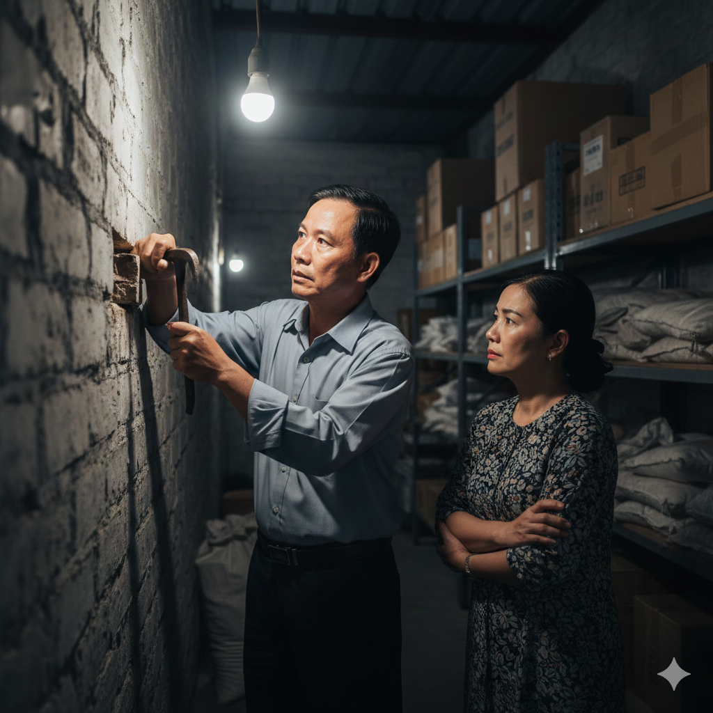 Mấy phút sau, khi âm thanh phía trên hoàn toàn im bặt, ông Lâm gắng sức kéo một thùng gỗ lớn sang một bên, rồi quỳ xuống cạnh bức tường. Ông đưa tay cạy đúng một viên gạch cũ kỹ, như thể ông đã thuộc từng khe hở của nó từ lâu.