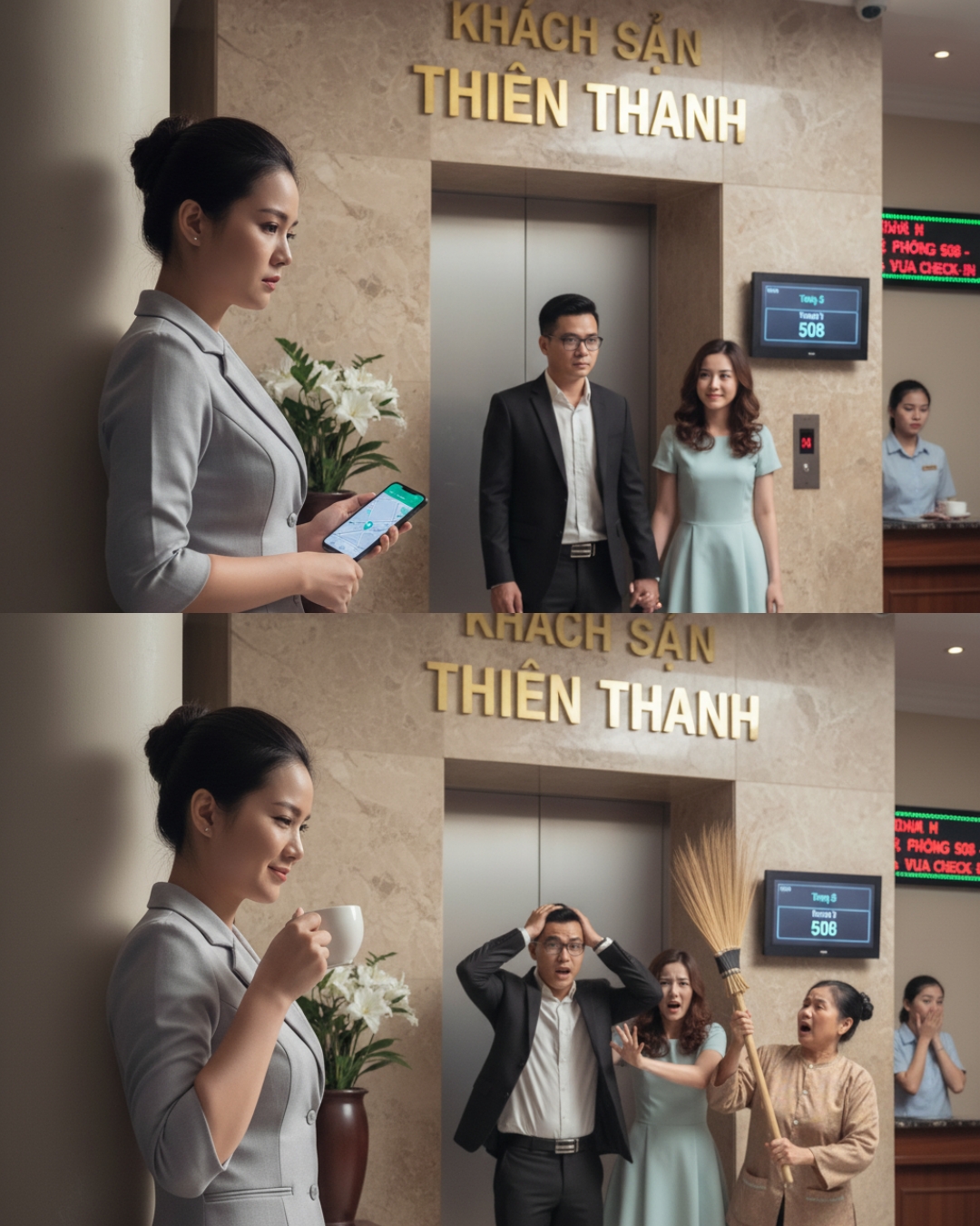Bà Hạnh bước vào quầy lễ tân, nói điều gì đó với nhân viên, rồi lập tức lên thang máy. Vài phút sau, tiếng la hét vang lên từ tầng năm, vọng xuống cả sảnh.