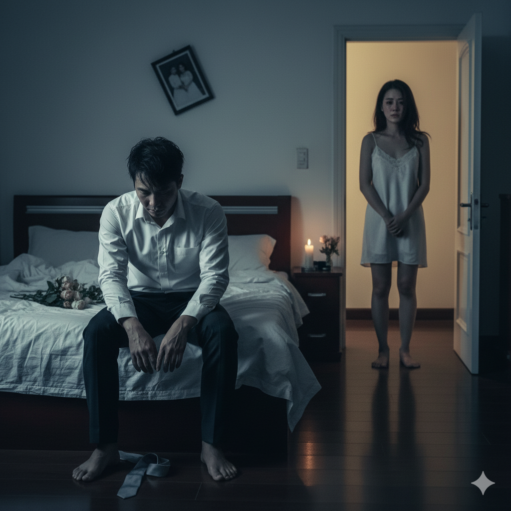 Ngày ra viện, tôi về nhà trước cô.Phòng tân hôn vẫn nguyên như cũ — hoa héo, nến tàn, chăn xộc xệch.Tôi ngồi xuống giường, nhìn lại bức ảnh cưới trên tường: hai người cười tươi, hạnh phúc, như thể trên đời chẳng có gì có thể chia cắt.