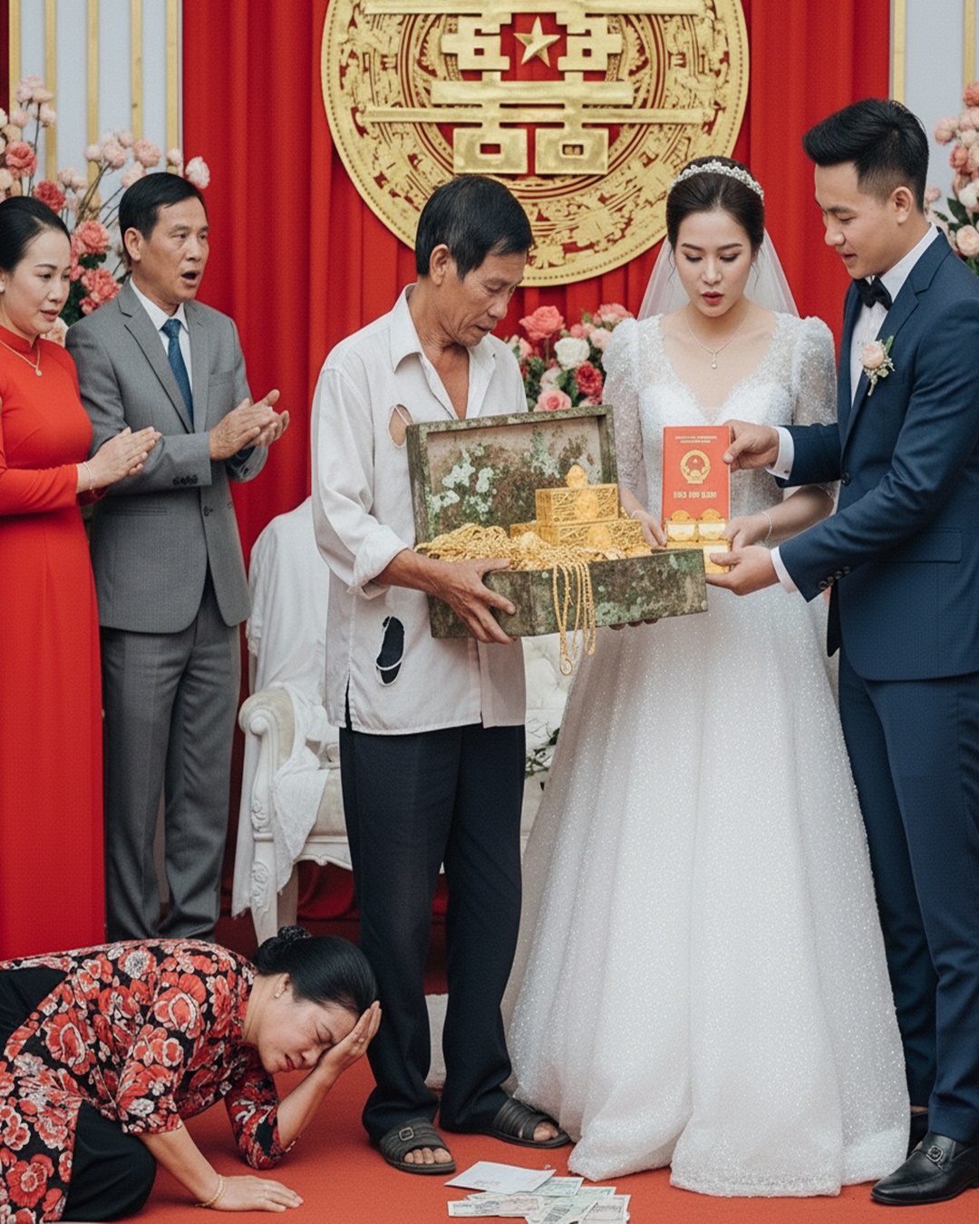 Tiếng xì xào dậy khắp hội trường. Hạnh đứng chết lặng.Bố mẹ cô ngồi hàng ghế dưới, ánh mắt ông Nam – người cha tóc đã bạc vì con – khẽ run lên. Ông siết chặt tay, cố giữ bình tĩnh. MC hơi lúng túng, rồi mỉm cười gượng gạo: “Xin cảm ơn bên nhà trai! Giờ xin mời đại diện nhà gái – bố cô dâu lên trao quà cho con gái và con rể!”