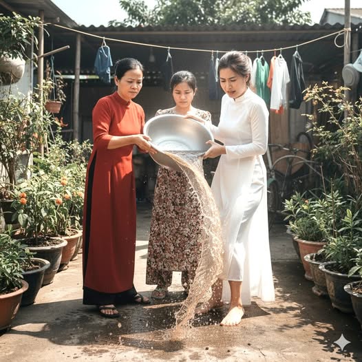 Sáng sớm hôm sau, mẹ chồng sai tôi gội đầu bằng nước bồ kết để “rửa vía”, nói rằng con dâu mới phải tẩy xui cho nhà. Tôi lễ phép làm theo. Trong lúc tôi đang cúi đầu bên chậu nước, cô em chồng – Hằng – bước tới, miệng cười nửa miệng: