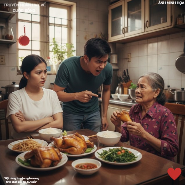 “Mẹ không nghe rõ sao? Tôi hỏi mẹ gắp chi miếng đùi gà đó!” Hùng nhìn chằm chằm vào mẹ mình, ánh mắt tràn ngập vẻ khinh miệt và tức giận vô cớ. “Cả tuần nay toàn rau với đậu, cơm đã không đủ no, mẹ còn định ăn hết phần của thằng Tí à? Nó đang tuổi lớn, cần chất.”