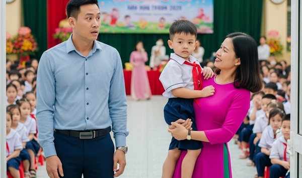“Ba ơi, cô giáo con kia rồi!” Bin reo lên, chỉ tay về phía sân khấu. Tôi nhìn theo hướng tay con. Cô giáo chủ nhiệm của Bin tên là Thảo, một người phụ nữ trẻ, dịu dàng, nghe nói mới chuyển về trường công tác được vài tháng. Tôi dắt Bin len qua đám đông phụ huynh để lên tặng hoa cho cô.
