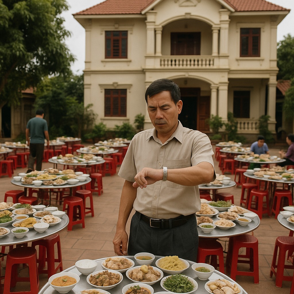 “Chào anh chị, tôi là Tân, nhà bên kia. Hôm nay con trai tôi cưới vợ, mời các anh chị đến dự tiệc,” ông nói, giọng lạnh lùng, không hề có một chút ấm áp.