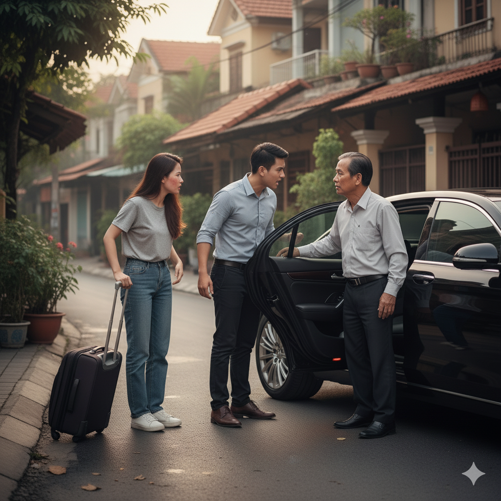 Đêm sau, khi cả nhà chìm vào giấc ngủ, tiếng xe rền rĩ dừng lại trước cổng. Mai giật mình, nghe tiếng gõ cửa dồn dập. Cô ra mở, đứng yên khi thấy bố mình đứng đó, áo mưa ướt sũng, mặt đầy vẻ cương nghị. “Bố…” – Mai chưa đáp nói gì, ông Tuấn đã bước vào nhà, giọng trầm nhưng chắc chắn: “Gọi thằng Hùng dậy. Bố cần nói chuyện.”