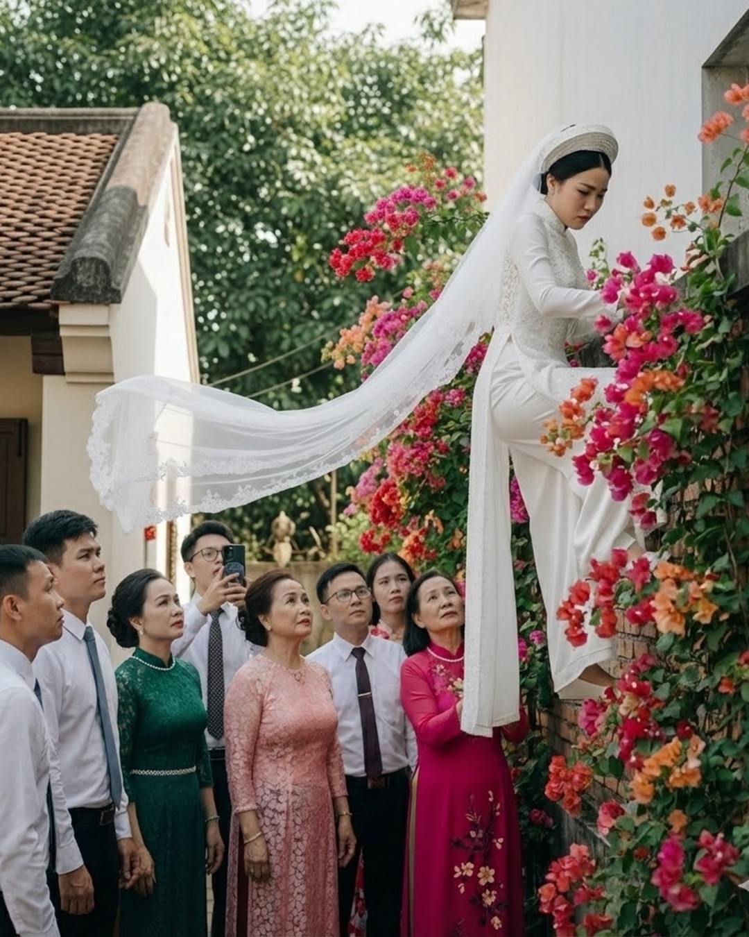 Và trước sự chứng kiến của hàng trăm người, cô dâu của tôi xách váy, đi vòng ra phía sau nhà. Bức tường rào cao hơn hai mét, đầy rêu mốc. Thảo tháo giày cao gót, đôi chân trần bám vào từng kẽ gạch. Chiếc váy cưới ren ngoại nhập bị rêu xanh bám bẩn, rồi rách toạc một mảng lớn khi vướng vào cành cây khô.