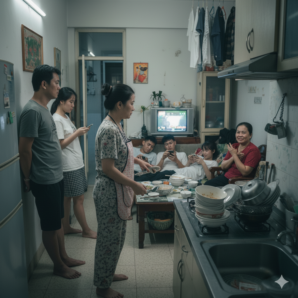 Đến trưa, mẹ chồng vốn quen có cơm canh tươm tất, nay đành ngồi thở dài, nhìn căn bếp ngổn ngang. Cả nhà bắt đầu lục đục, ai cũng đùn đẩy việc.
