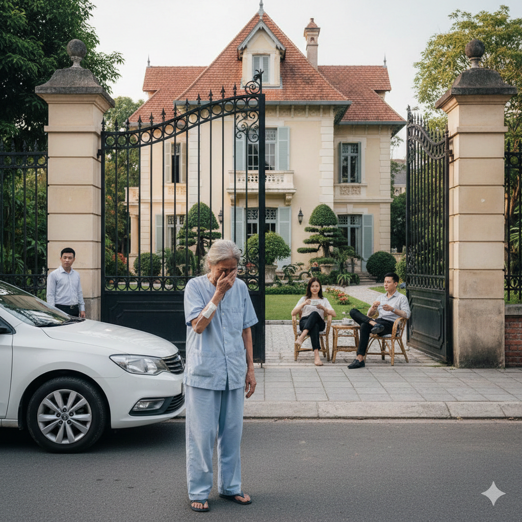 Chiều hôm ấy, hành lang bệnh viện vắng đến lạnh người. Bà Thìn, 68 tuổi, bấm gọi điện cho con trai—Lâm—đến cuộc thứ mười mà vẫn chỉ nghe tiếng tút dài vô cảm. Bà vừa khâu xong hơn mười mũi ở cánh tay sau cú ngã cầu thang, bác sĩ dặn phải có người đưa về. Nhưng Lâm không bắt máy. Vợ nó, Hòa, cũng im lặng như tắt hơi.
