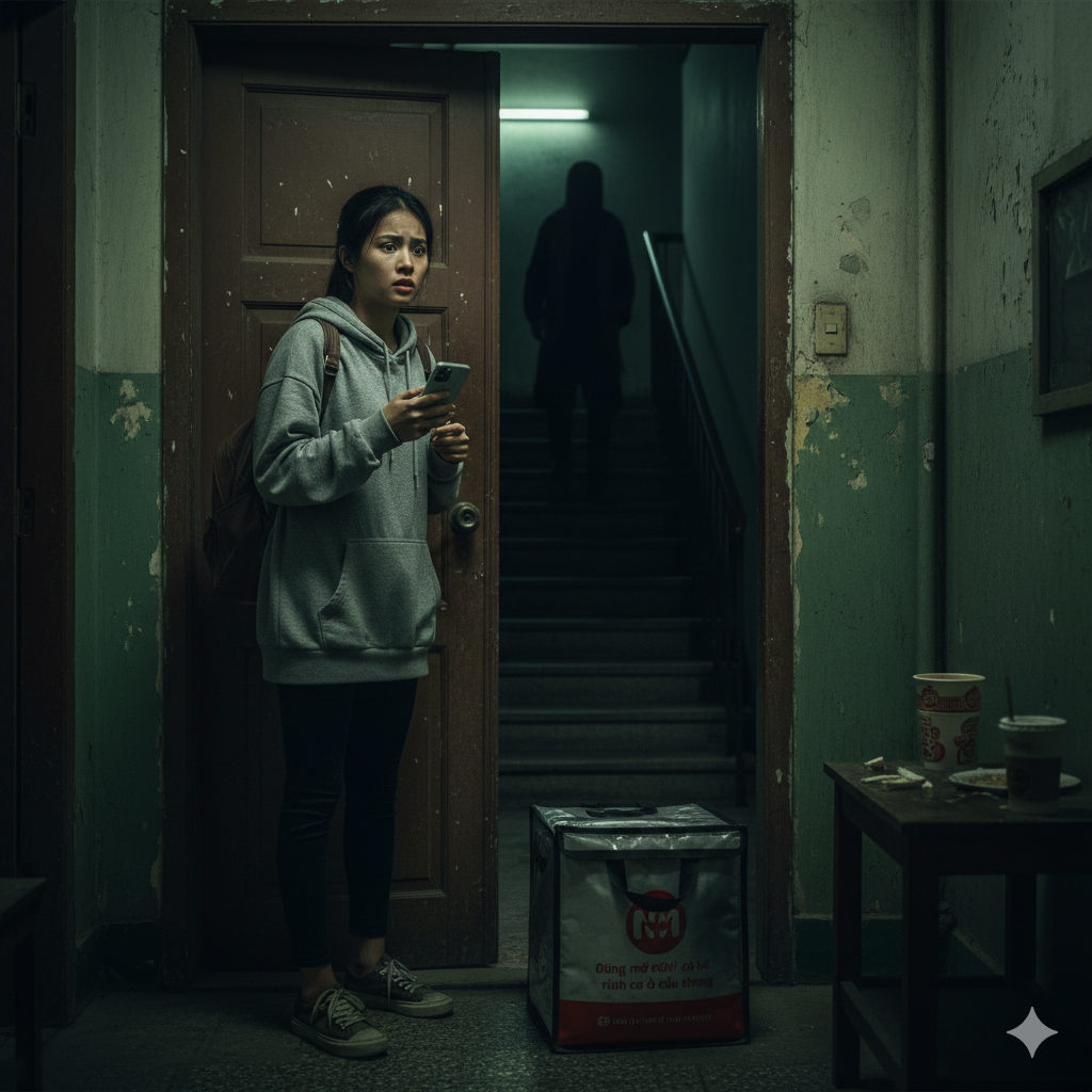 Shipper: “Đừng mở cửa!!! Có người đang rình cô ở cầu thang!”