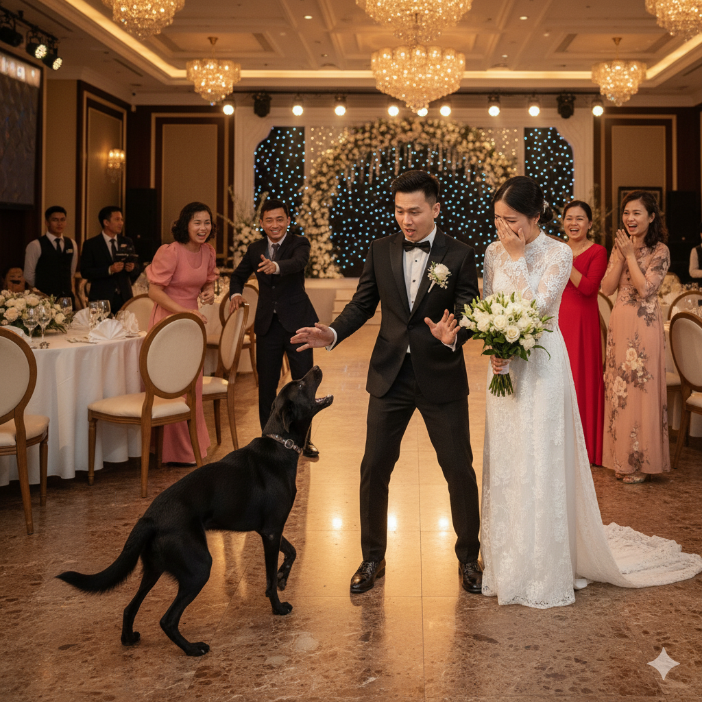 Buổi lễ diễn ra trong tiếng nhạc, hoa và ánh đèn lung linh. Khi MC giới thiệu chú rể bước lên sân khấu, tiếng vỗ tay vang dậy.Minh nắm tay tôi, ánh mắt ấm áp. Nhưng đúng lúc đó, một tiếng sủa vang lên chói tai.