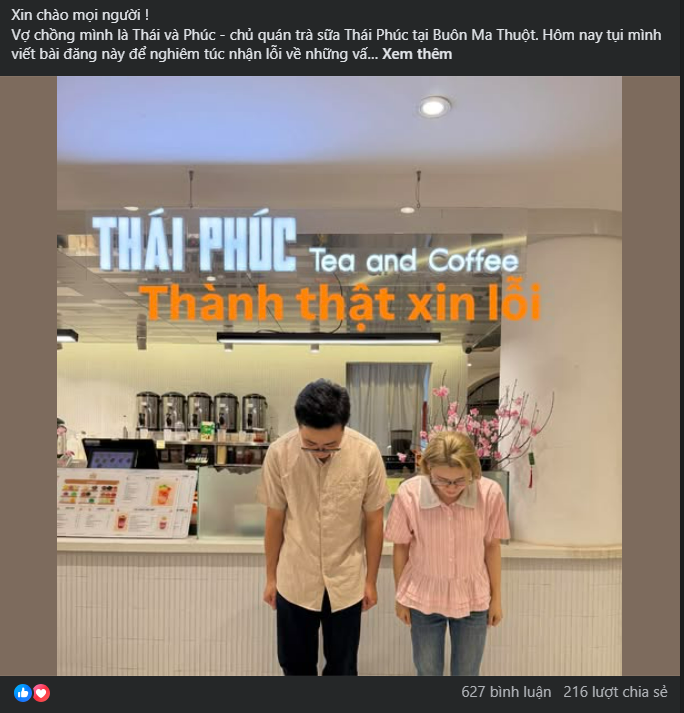 Sau phản ánh, chuỗi trà sữa T.P. đăng tải lời xin lỗi trên mạng xã hội Facebook, gửi tới họa sĩ Trần Thành Đạt, Nhà sách Phương Nam và khách hàng.