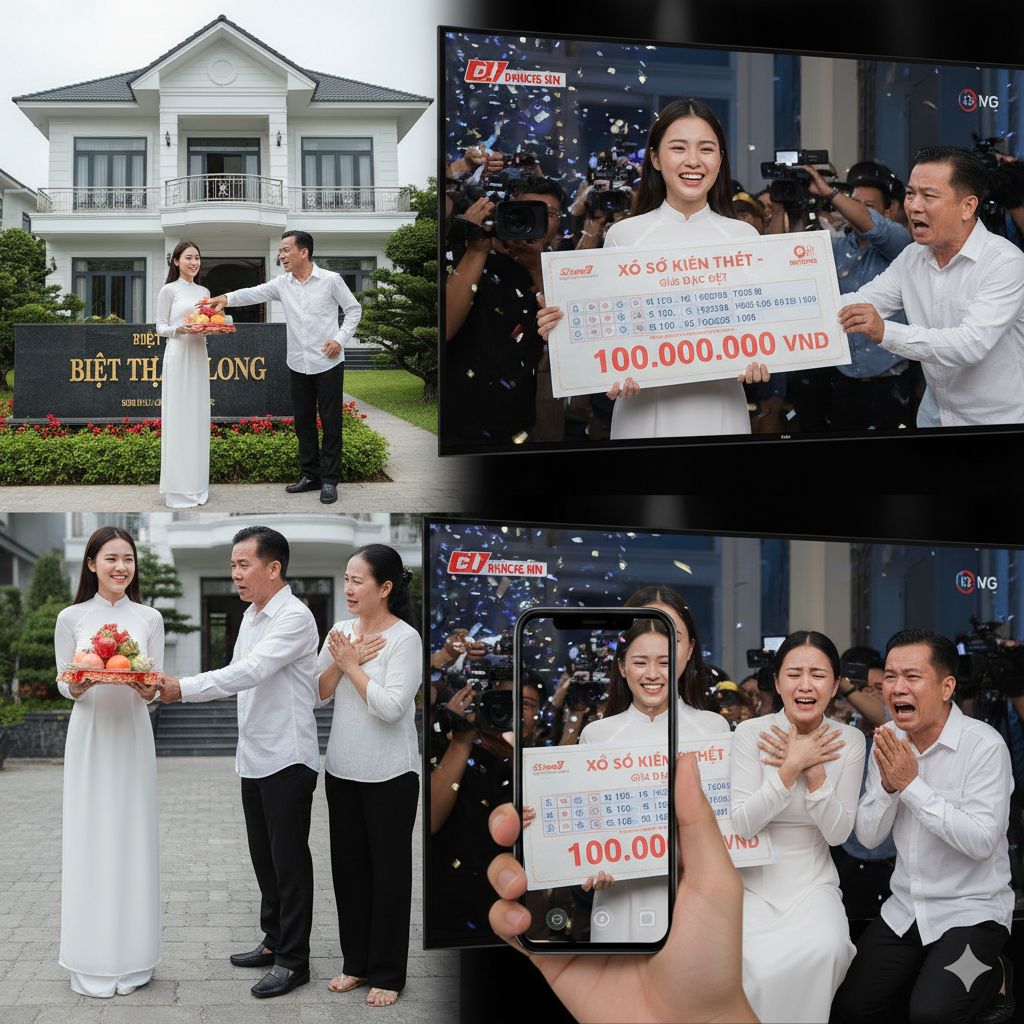 Màn hình tivi chiếu tôi – gương mặt ngơ ngác, tóc ướt mưa, tay run khi cầm tấm vé số trúng giải độc đắc 30 tỷ.