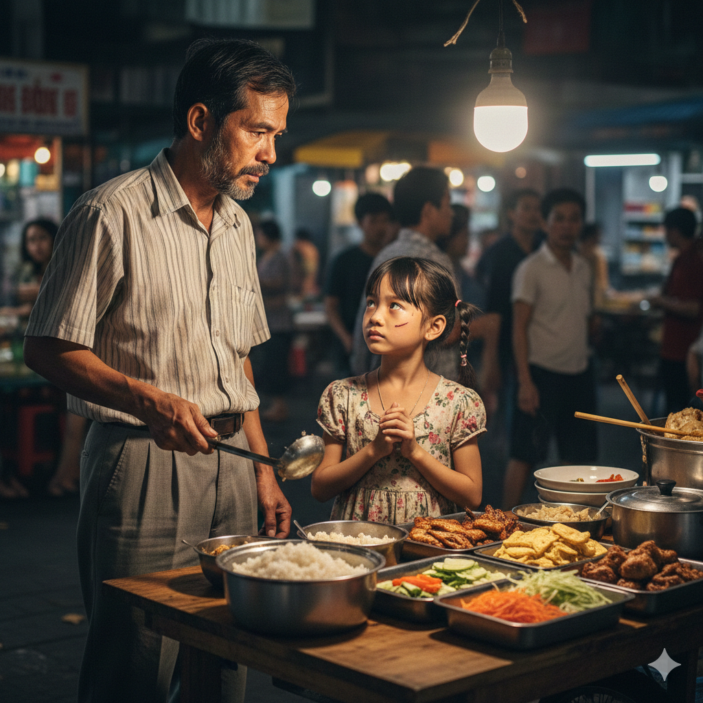 Chiều hôm đó trời đổ mưa, tôi ghé quán cơm tấm quen góc hẻm. Vừa gọi món xong thì nghe giọng trẻ con run run phía sau: