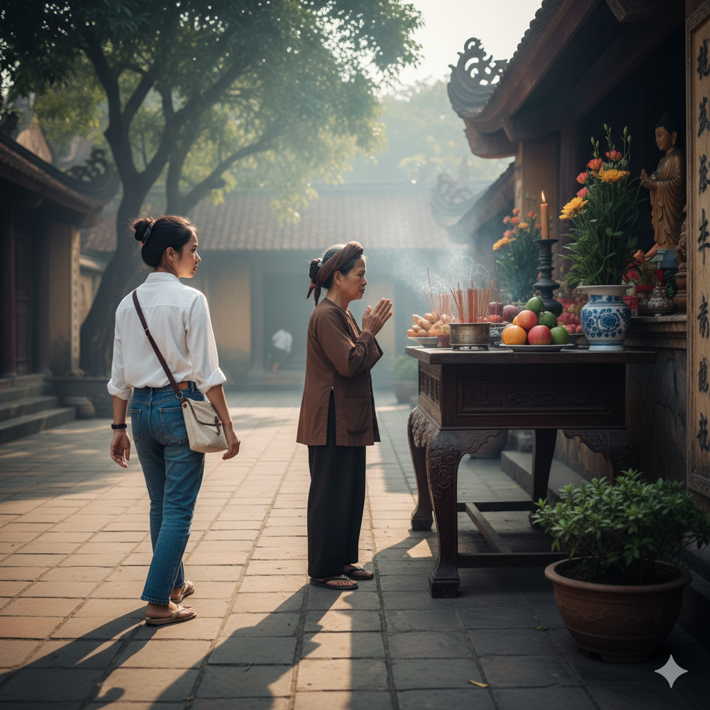 Một tiếng động nhỏ phía sau kéo tôi khỏi dòng suy nghĩ. Là chồng tôi – Minh – đang bước tới. Anh vừa đến sau lễ, định cùng mẹ khấn.