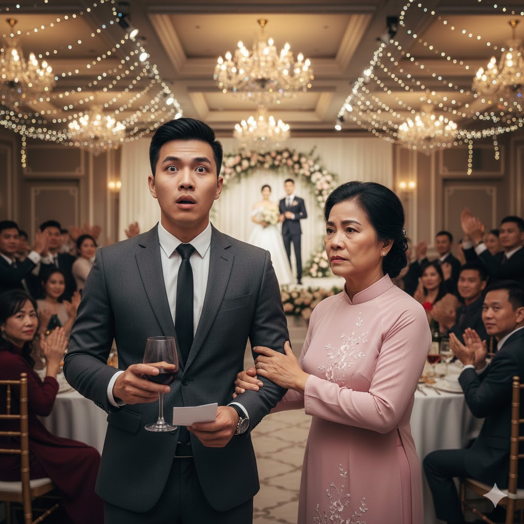Tôi nâng ly khi cô dâu chú rể đi đến từng bàn. Nhưng bất ngờ, khi Thu chưa kịp chạm ly với tôi, mẹ cô ấy đã đi theo, ghé sát, đặt vào tay tôi một mảnh giấy nhỏ.