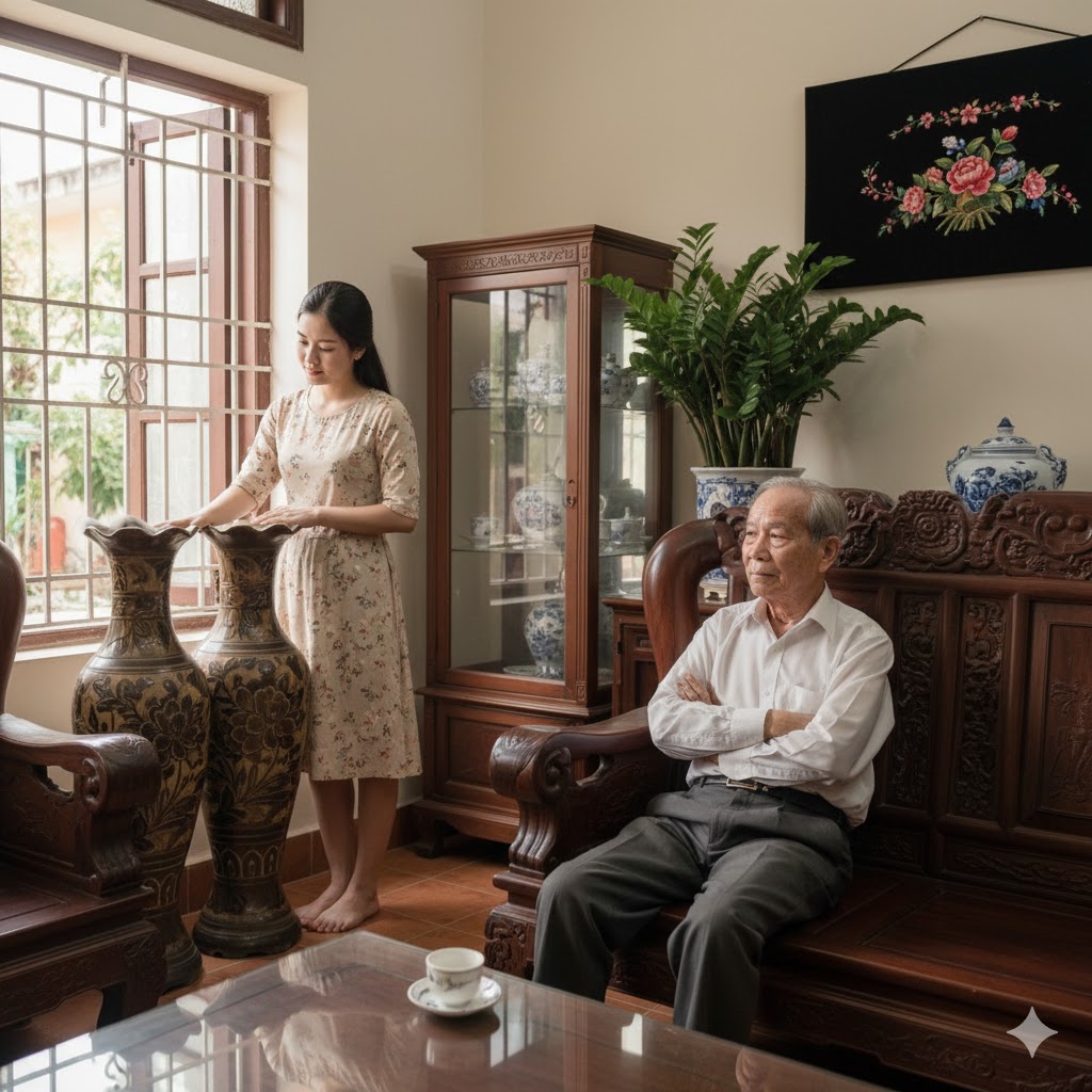 Hôm tôi về ra mắt, cả nhà chồng quây quần trong gian khách. Tôi nghe phong phanh bố chồng là người rất ngăn nắp, hơi khó tính. Nhưng khi tôi bước vào, ông nhìn tôi từ đầu đến chân, rồi chỉ tay về góc gian giữa nơi đôi lục bình đứng sừng sững: