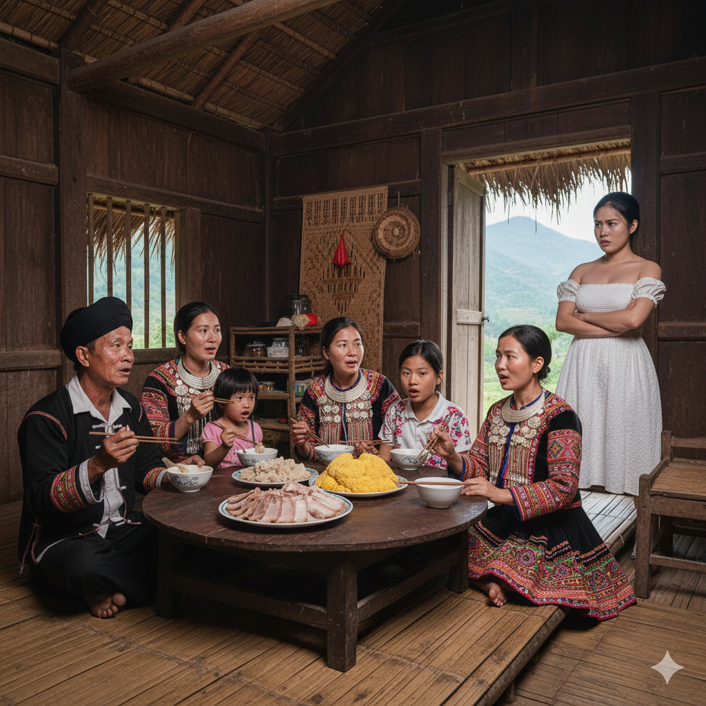 Họ mời chúng tôi vào, lấy ra cái bàn gỗ thấp, bày lên chiếc mâm nhôm cũ. Trên mâm là một bát cơm trắng còn bốc khói, một đĩa thịt lợn rừng luộc, một đĩa mèn mén vàng như cát, bát muối ớt giã dối, và một đĩa lá mắc mật luộc xanh non. “Cơm… cơm trắng?” tôi thốt lên, không kịp che ngạc nhiên. Ở thành phố, cơm trắng chỉ là cơm. Ở đây, có lẽ là điều gì khác, nhưng tôi không biết khác thế nào. Mẹ chồng tôi, người đàn bà ít nói với đôi mắt đen và vết nhăn xếp gọn dưới đuôi mắt, đẩy bát cơm về phía bố mẹ tôi: “Cơm mới đấy, tôi để dành hôm nay. Các ông bà ăn cho chắc bụng. Mèn mén ở đây người quen ăn, người lạ khó ăn, ăn không quen là sôi bụng.” Bà nói chậm, giọng đặc miền núi. Tôi nhìn mèn mén, thở nội trong ngực. Tôi đã thấy bao nhiêu video khen đặc sản vùng cao, vậy mà khi bốc một dúm, hương ngô xay khô xộc lên, bột ngô nở bông mà tơi nhuyễn, dẻo đâu không dẻo, tôi không thể nuốt. Thịt lợn rừng luộc thì thơm, nhưng cũng khô, hơi cứng. Tôi nghĩ về những món hầm mềm mịn, nghĩ về một cái gì dễ trôi hơn sau một ngày dài. Bố mẹ tôi ngại ngùng, rón rén mỗi người một miếng, còn tôi bỗng thấy mặt mình nóng bừng, như bị cả chuyến đi vả cho một tá cú tát không tiếng.