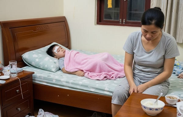 Anh bật đèn. Một “bãi chiến trường” hiện ra. Thằng Tôm, con trai anh, đang nằm mê man trên giường. Mặt nó đỏ bừng, hơi thở khò khè, nặng nhọc. Quần áo nó ướt sũng mồ hôi, và cái tã nó đang mặc đã trĩu nặng, chất bẩn tràn cả ra ga giường.