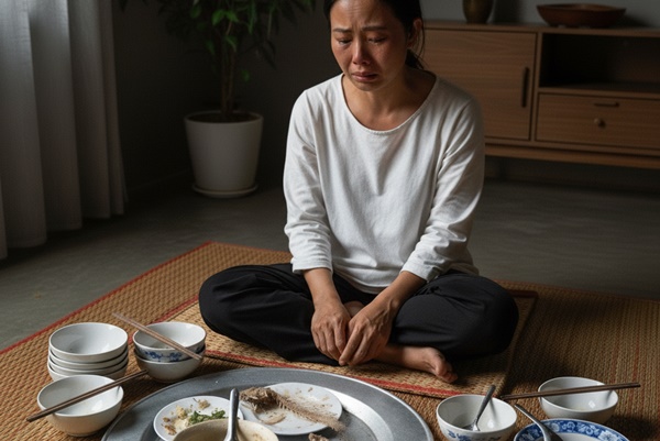 Tuấn ngồi đó, nhìn cảnh ấy, trong lòng dậy lên một nỗi nghẹn. Anh bỗng nhận ra — lần nào về cũng thấy vợ ăn sau cùng, và lần nào cũng là mấy món thừa nguội ngắt.