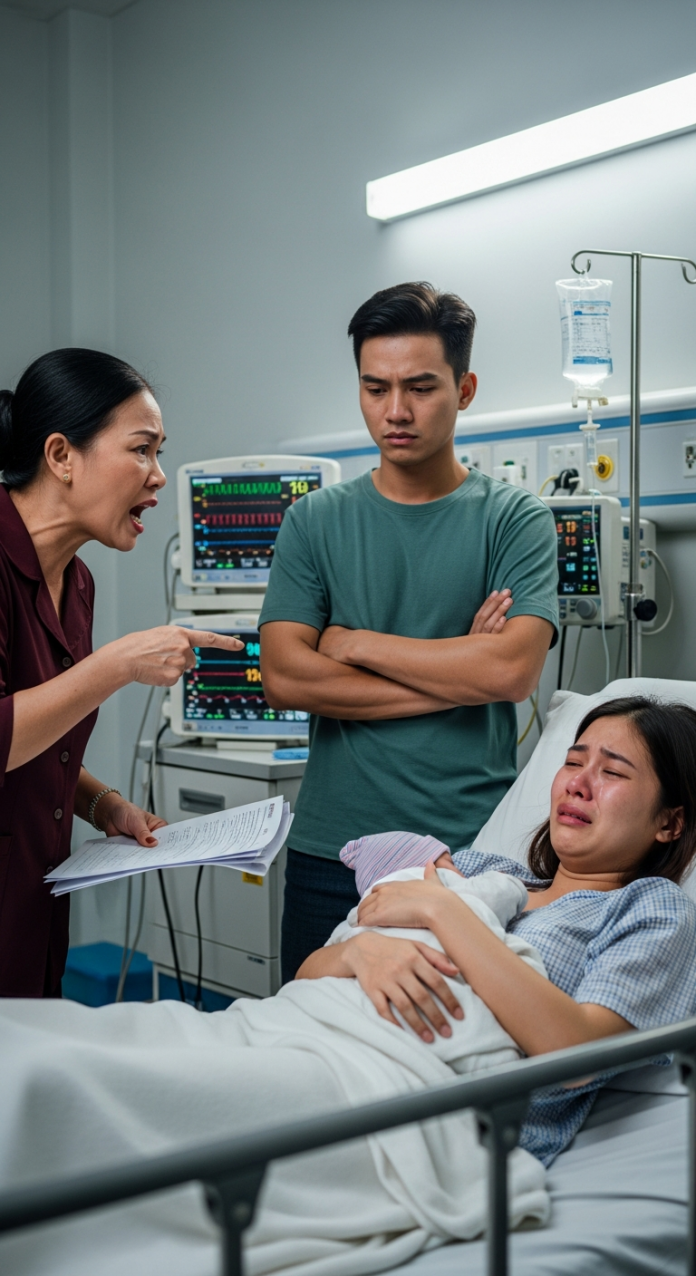 Bà Mai – mẹ chồng cô – cùng chồng cô là Minh bước vào. Trên tay họ không phải là bát cháo nóng hay đóa hoa chúc mừng, mà là một tệp tài liệu dày cộp.